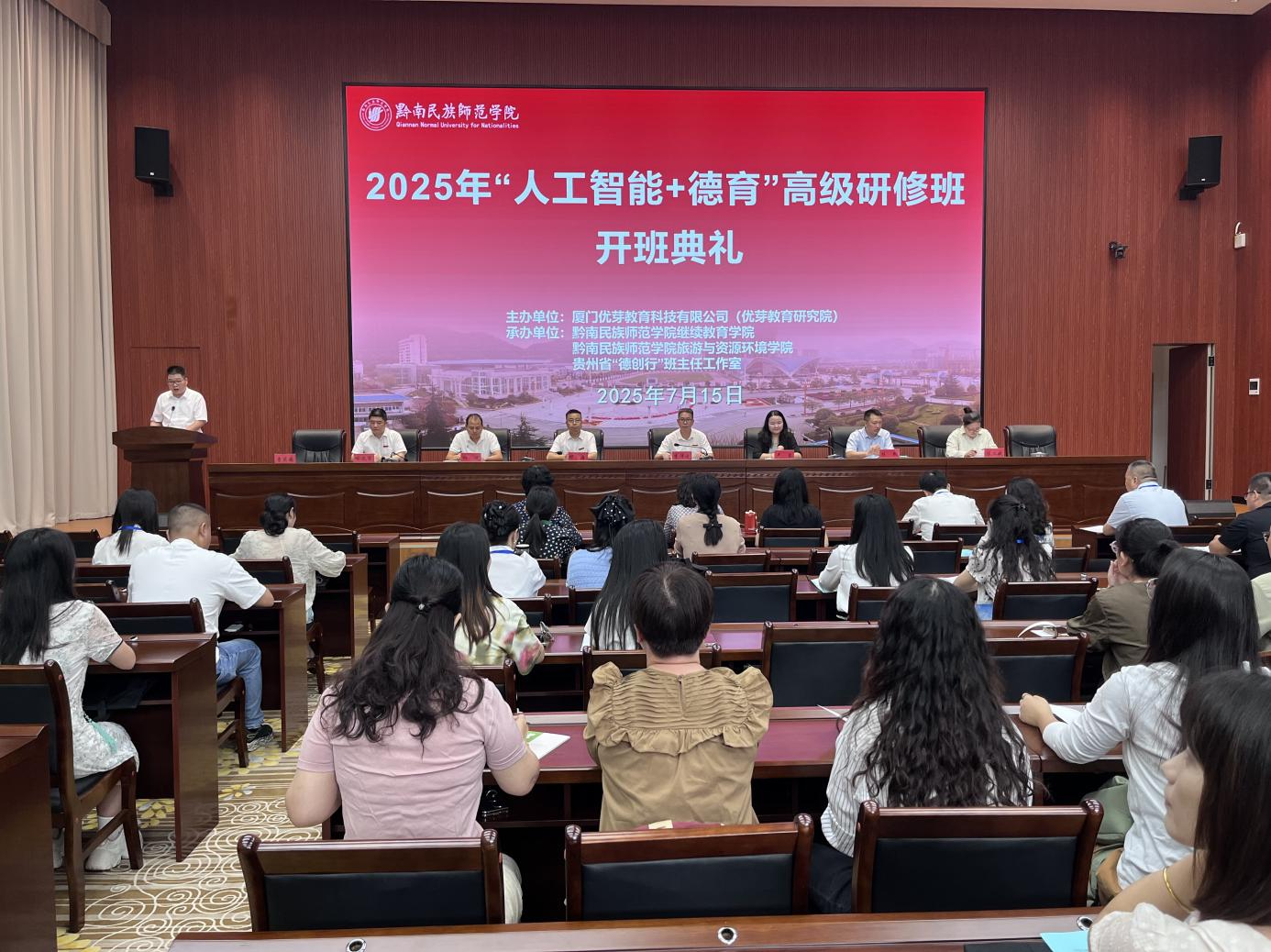 7月15日上午,2025年“人工智能+德育”高级班开班典礼正在黔南平易近族师范学院举行。黔南平易近族师范学院继续教育学院协办,为新时代育人工做注入科技活力。为本次班的成功开展供给告终实的实践支持。